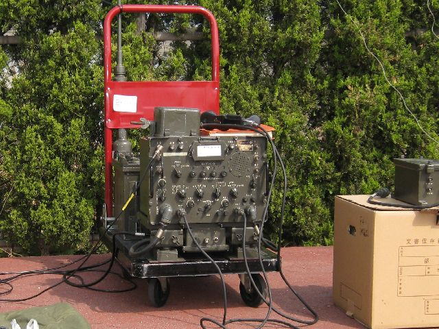 JA3FTU局のGRC-9は、受信用電池BA-48同等自作品(FM-85の上にある横長の箱)+手回し発電機(GN-58)による構成と、24V電源駆動による自作DC/DCコンバーター(FM-85の背中にある縦長のケース)の構成の2つを運用、前者手回し発電機による構成では送信前に適度に予測して発電機を廻し始めても十分実用になりました。 (なお、左に見える機材はRT-427/ARC-39、3530Kcや3800Kcがプリセット)