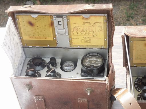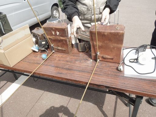 JA3DMO局の旧日本軍の通信機です。下の写真は背面側です。L型に構成されたアンテナエレメントは水平が地線、垂直が輻射エレメントを構成、後にL型ダイポールと某アンテナメーカが名づけた形式です。 |