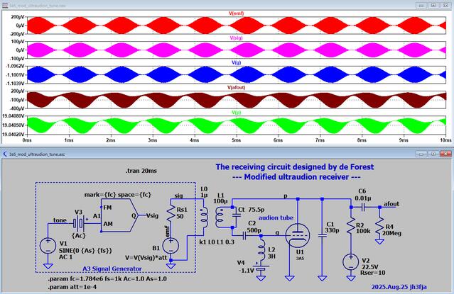 3極管およびその基本応用回路(検波回路、増幅回路、送信回路)の発明者であるデ・フォレストが改良を重ねた後期の Audion receiver の回路シミュレーションをやってみました。