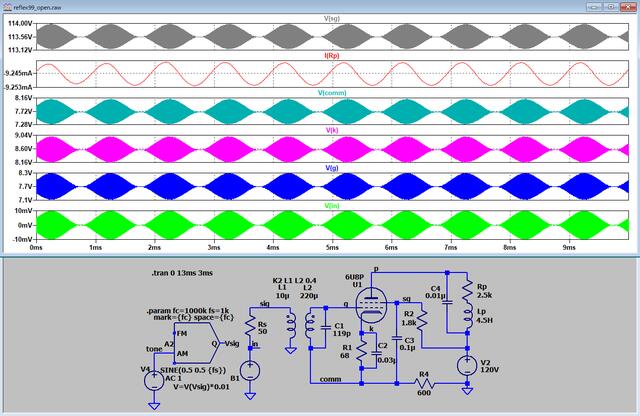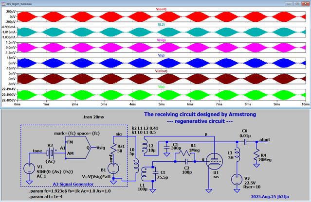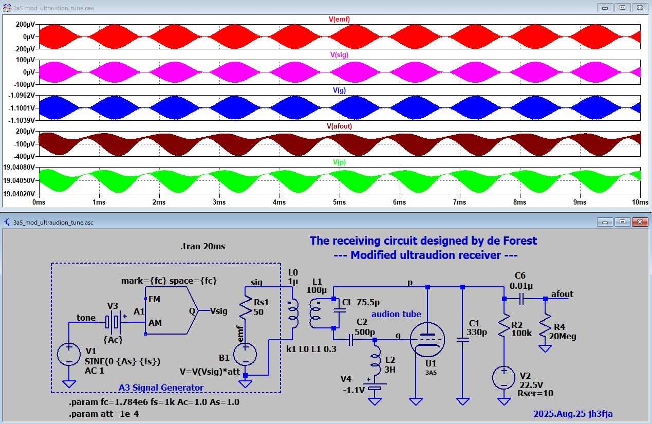 2枚目はアンテナ入力からRF増幅した出力をコモン(comm)電位(R4抵抗の左端)の振れ(変化)で取り出すところまでを眺めた回路シミュレーションです。 信号元起電力10mVのAM変調信号(キャリア1MHz、ベースバンド信号1KHz正弦波)をアンテナ端子から入力し各点の時刻歴波形を観ています。出力(コモン電位の振れ)は 440mV(=(8.16V-7.28V)/2)、これが検波を受け持つ第2のLC共振回路にLリンク結合で渡ります(3枚目参照)。一方プレート側出力はレシーバ(ハイインピーダンス受話器)の大きなインダクタンスで高周波成分は阻止され低周波成分が主体の電流になっています。検波していないにベースバンド信号相似波形が得られるのは真空管の非線形特性によるものです。