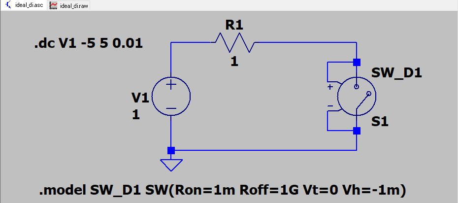 電圧制御スイッチ「sw」 を使い理想化ダイオードにしたものです。ダイオードを利用した回路において順方向抵抗や逆方向リーク電流の影響を任意に変えての確認などに活かせます。電圧制御スイッチ単体の特性記述は次の通りです。 .model モデル名 SW(Ron=オン抵抗値 Roff=オフ抵抗値 Vt=しきい値電圧 Vh=ヒステリシス幅電圧) ![]() ![]() 理想化ダイオードを2つ使い両波検波回路を構成した例です。 ![]() |
