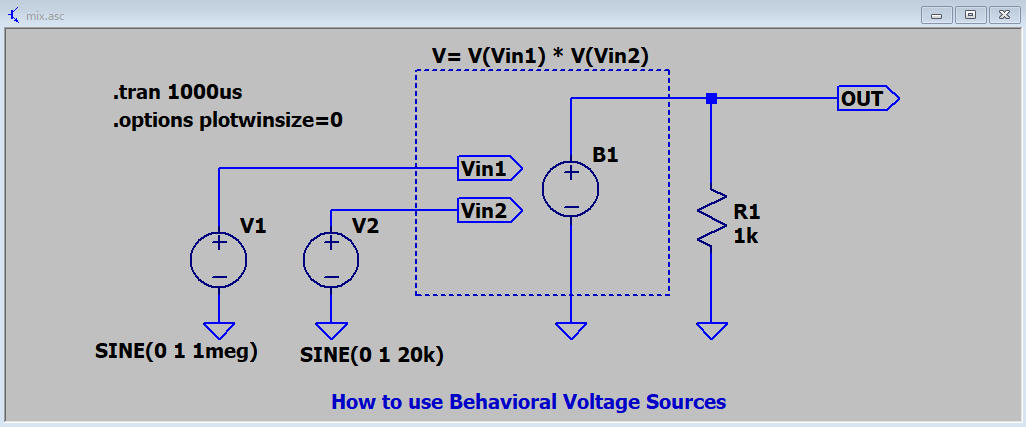 ビヘイビア電圧源「 bv 」 を使い2信号入力1信号出力の掛け算器を構成し変調器としたものです。